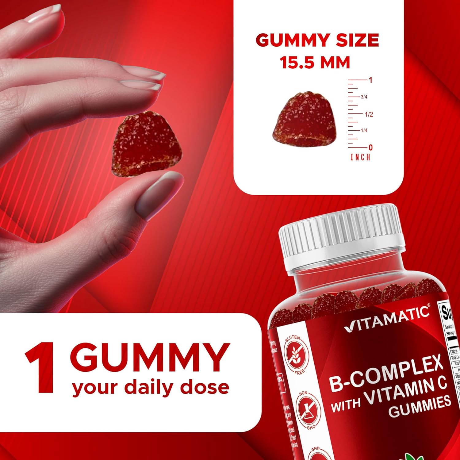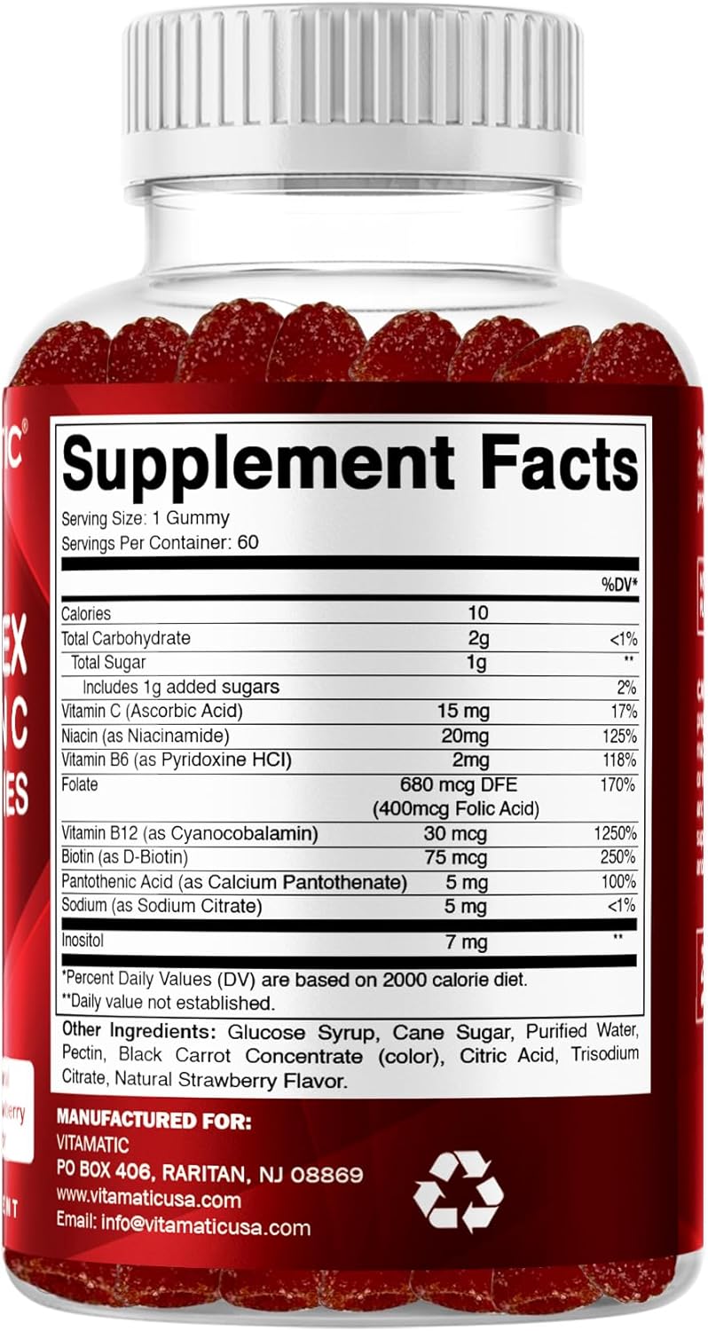 Vitamatic Vitamin B Complex Gummies with Vitamin C & Inositol – Natural Strawberry Flavor – 60 Gummies (1 Bottle)