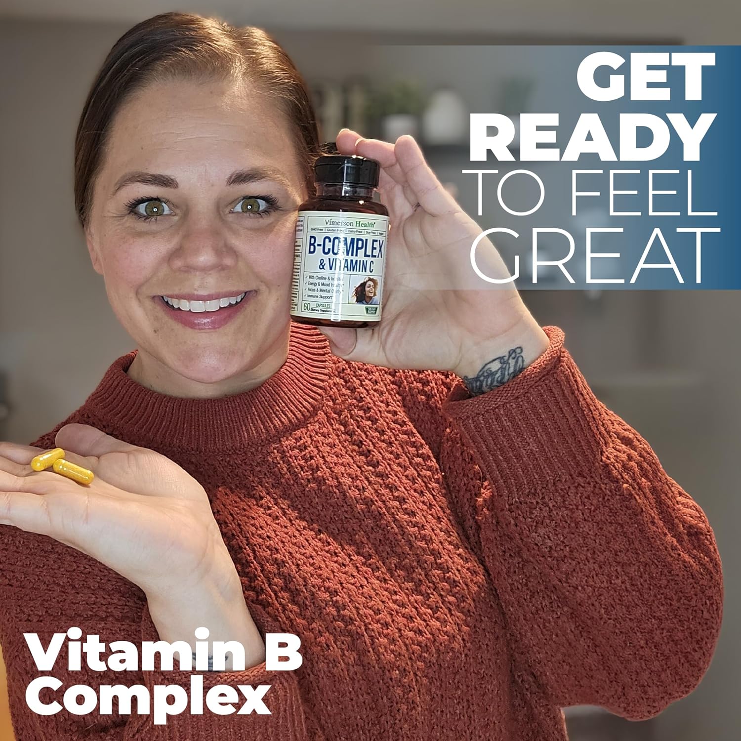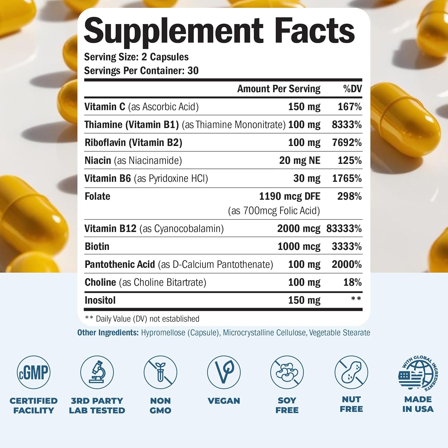 Vitamin B Complex with Vitamin C & Folic Acid (Folate) – 8 High Potency B Vitamins: B1, B2, B3, B5, B6, B7, Vitamin B12 + Biotin, Choline & Inositol. Aids Mood, Energy, Nervous System & Immune Support