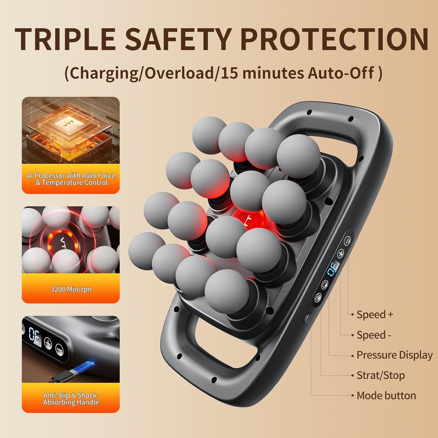 【Triple Safety Protection & 15-Minute Smart Protection 】: Engineered with Triple Safety Protection (Charging Protection + Overload Protection + Auto Shut-off), our massage gun prioritizes user safety and peace of mind. The ergonomic design reduces hand fatigue, while the 15-minute auto-shutoff prevents overuse,guarantees reliable operation and safeguards the device for long-lasting performance