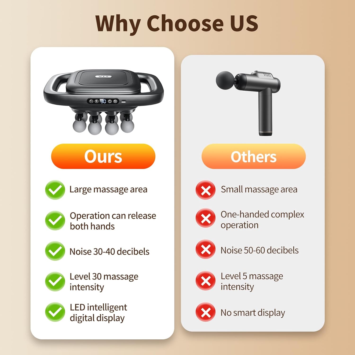 【3 Modes & 30 Intensity Levels】:VTT Back Massage Gun3 different modes (Soothe Muscle Tension, Muscle Awakening, Deep Fatigue Relief) and 30 intensity levels precisely act on specific muscle groups. From deep tissue to gentle relief, the muscle massage gun offering a variety of options for different muscle groups