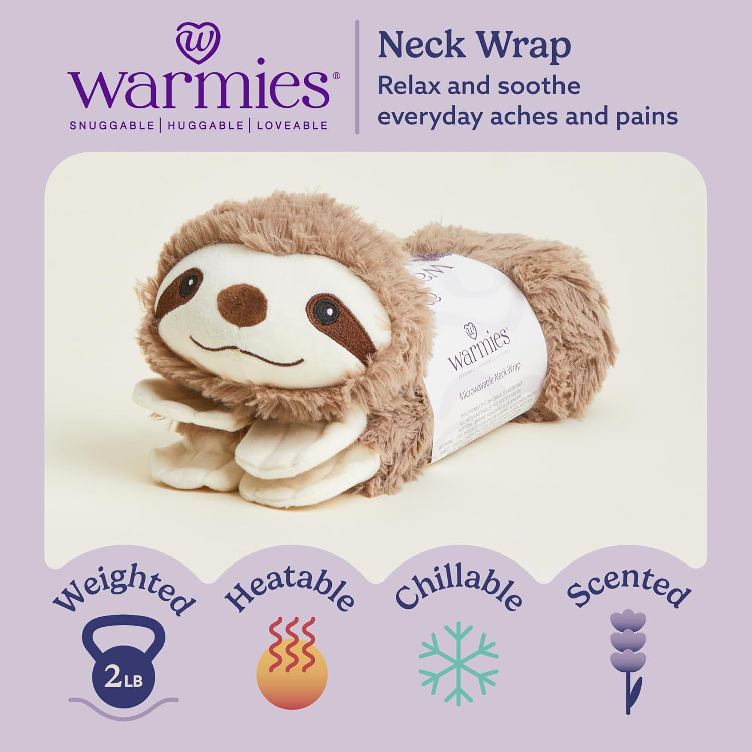 Warmies Neck Wrap: This cozy Sloth Warmies Luxury Neck Wrap can be easily heated to provide up to two hours of soothing warmth and comfort, or chilled for a cooling sensation. Scented neck wrap is one-size-fits-most. 2 lbs.