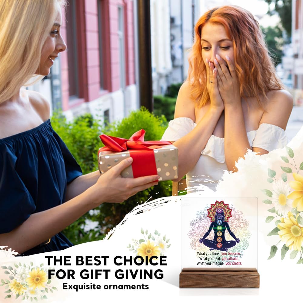 What You Think You Become Acrylic Sign with Wooden Stand, Funny Chakra Meditation Yoga Gifts for Coworker Friend, Inspirational Gifts for Yoga Lover Sister Women Entrepreneur
