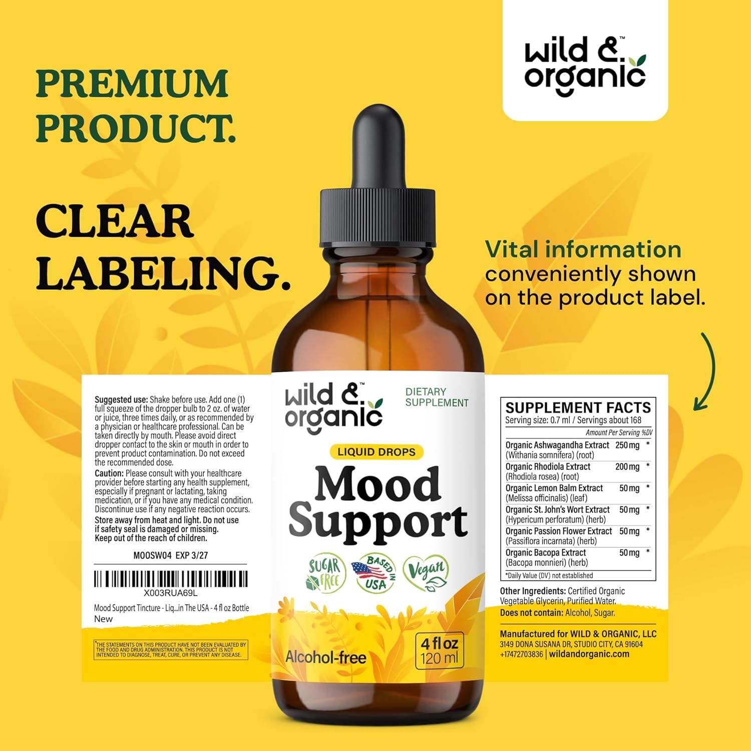 Mood Support: Each serving of Wild & Organic mood support tincture contains 300 mg of ashwagandha root and 200 mg of rhodiola rosea extract to support good mood and relaxation.