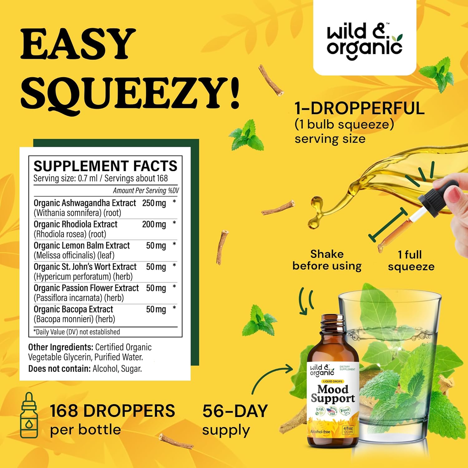 56-Day Supply: Each 4 fl. oz. bottle of Wild & Organic good mood supplements contains 168 servings per bottle, providing a 56-day supply when taken three times per day.