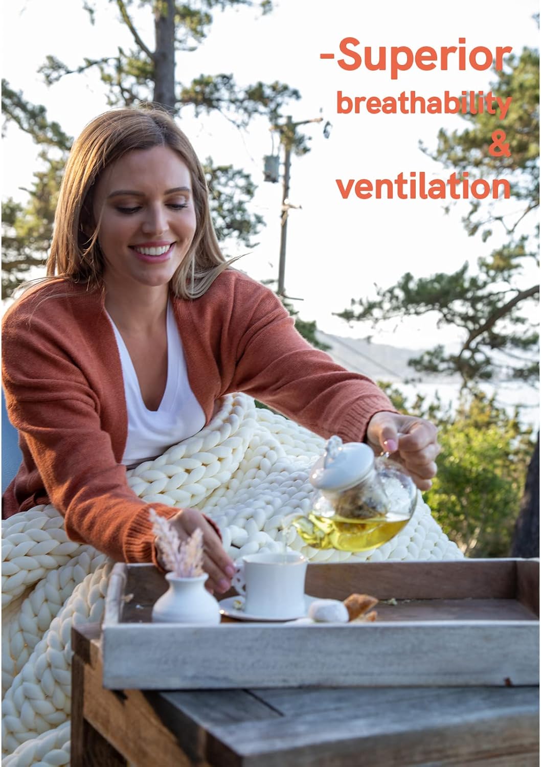 [Ventilated] Free airflow through loops on the blanket keeps the blanket breathable and high ventilation. It doesn’t retain much heat when placed on or around you, but it does provide a soothing and relaxing hugging sensation.