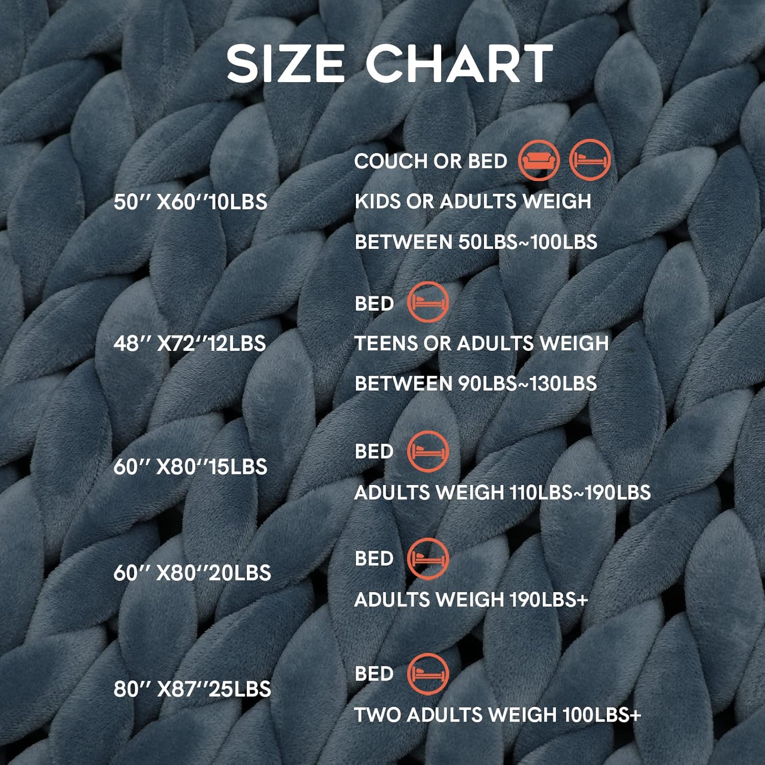 [Sizing Options] Our blankets come in 5 different sizes: 50″x60″ 10 lbs: Ideal for adults weighing between 50 lbs and 100 lbs. 60″x80″ 15 lbs: Perfect for adults weighing between 90 lbs and 140 lbs. 60″x80″ 20 lbs: Suitable for adults weighing more than 110 lbs. 80″x87″ 25 lbs: Can be used by one or two people over 160 lbs. 88″x95″ 35 lbs: Designed for two people on a queen or king bed who prefer extra weight. Note: The 60″x80″ size may be a bit small for two people to share comfortably.