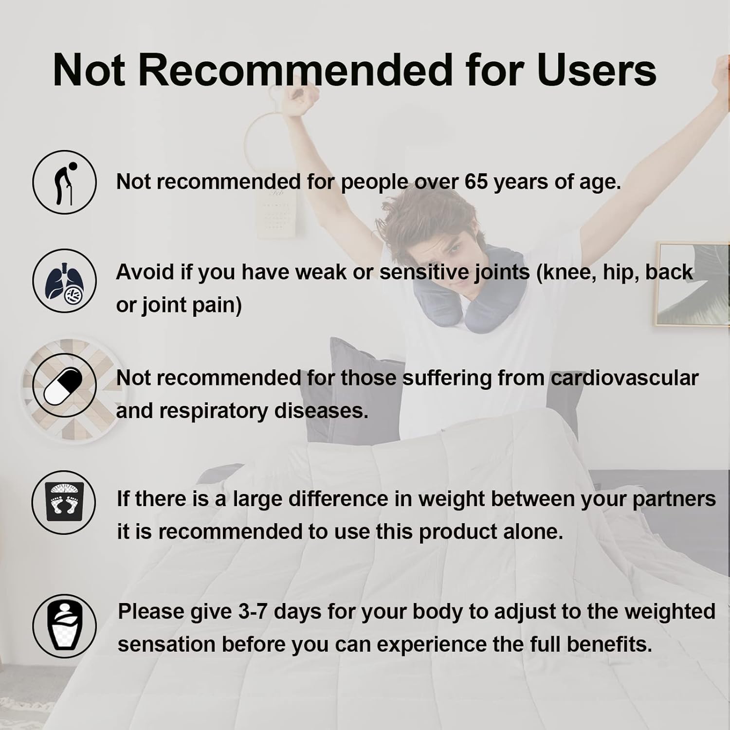 【HOW TO CHOOSE WEIGHT】For a weighted blanket, the optimal weight is around 8%-10% of your body weight based on experiments and market research. The 12lb weighted blanket is suitable for adults weighing between 130lb and 160lb. Please allow your body 7-10 days to adjust to the weighted blankets when using it for the first time.